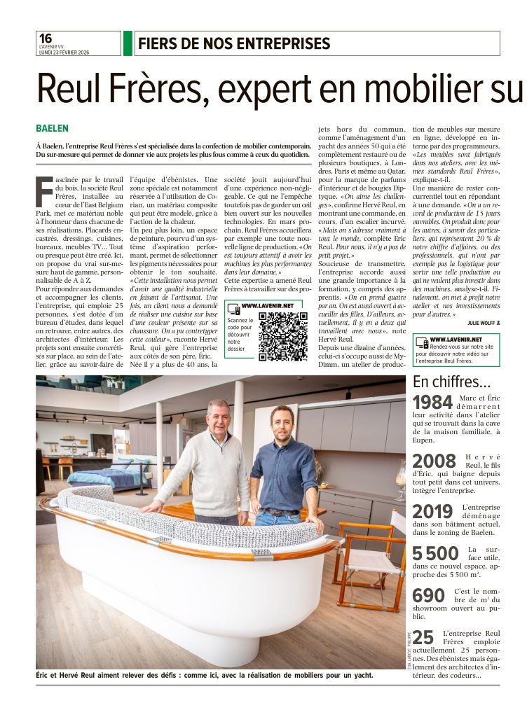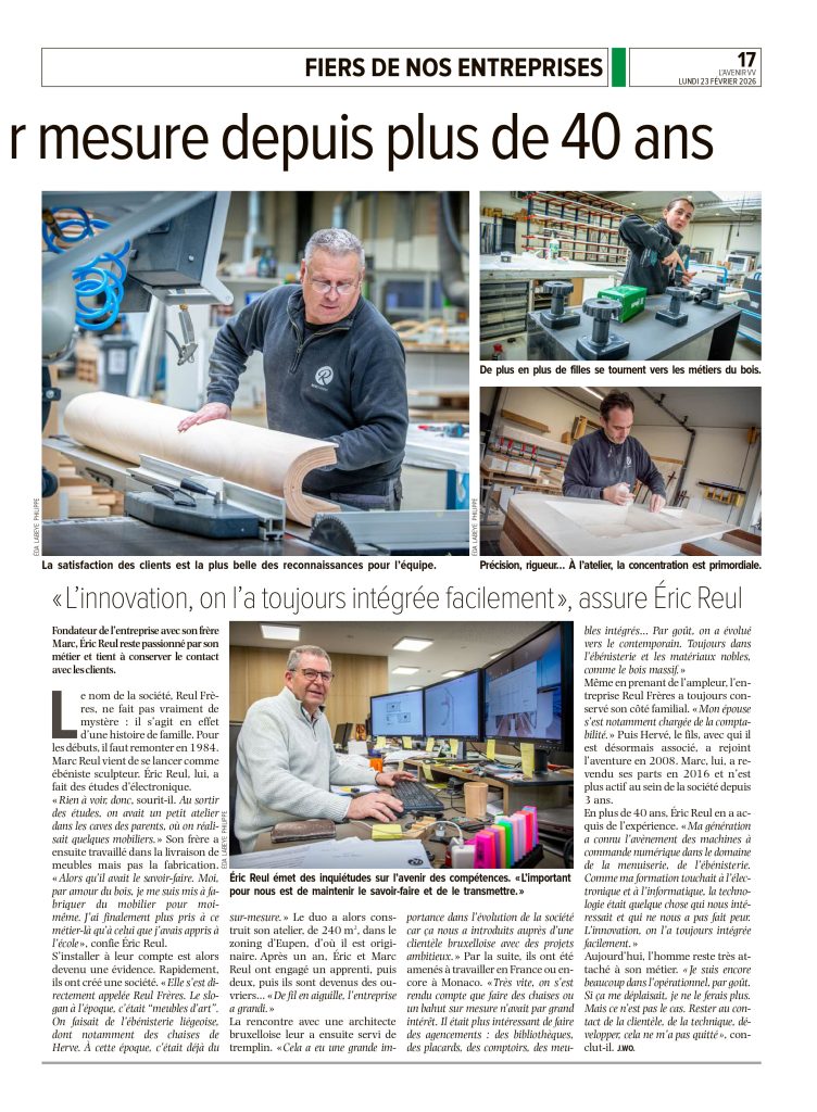 Être reconnu pour plus de 40 années d’expertise en mobilier sur mesure est une belle récompense. Dans son édition du 23 février 2026, L’Avenir met en lumière notre ADN : un savoir-faire artisanal exigeant, soutenu par des technologies de pointe, au service de projets sur mesure en Belgique et à l’international.