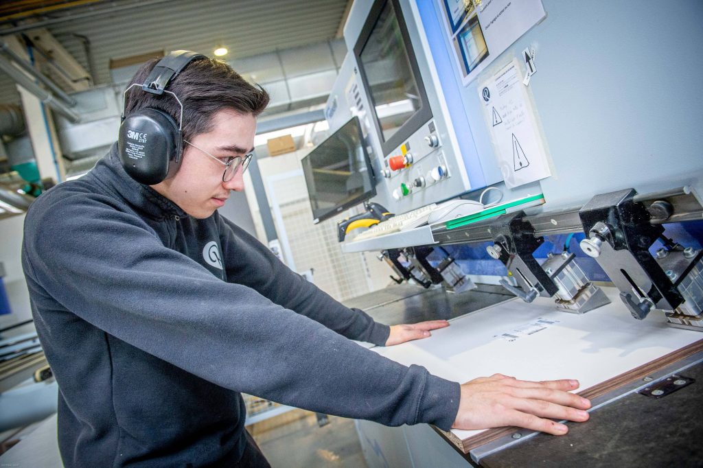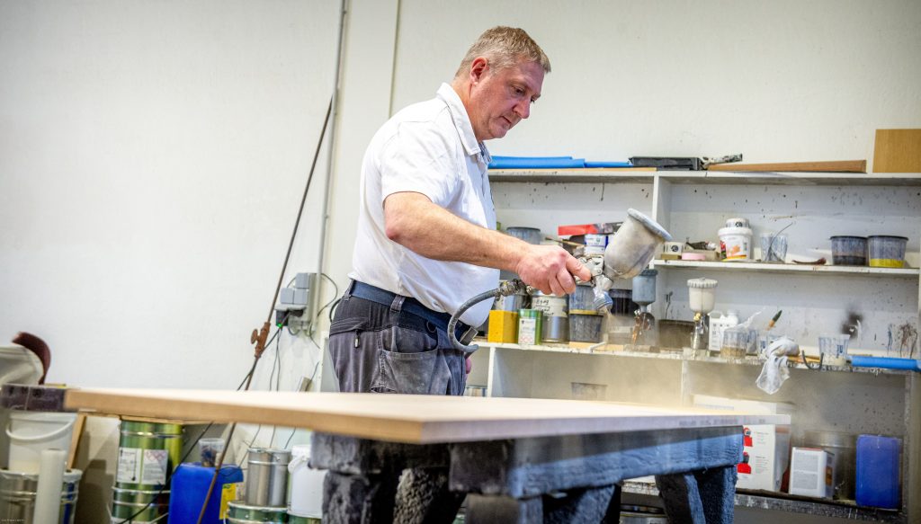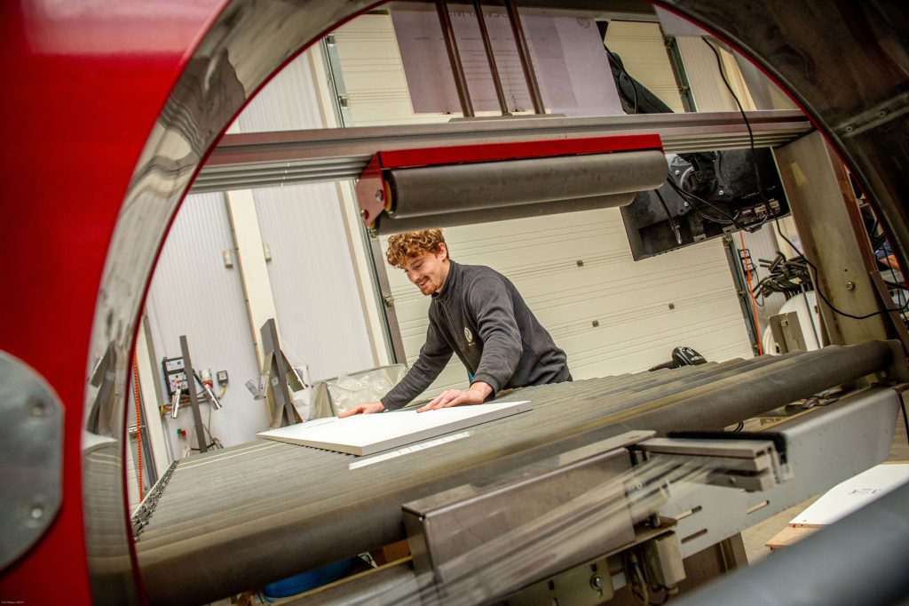 « Cette installation nous permet d’avoir une qualité industrielle en faisant de l’artisanat. Une fois, un client nous a demandé de réaliser une cuisine sur base d’une couleur présente sur sa chaussure. On a pu contretyper cette couleur », raconte Hervé Reul, qui gère l’entreprise aux côtés de son père, Éric.