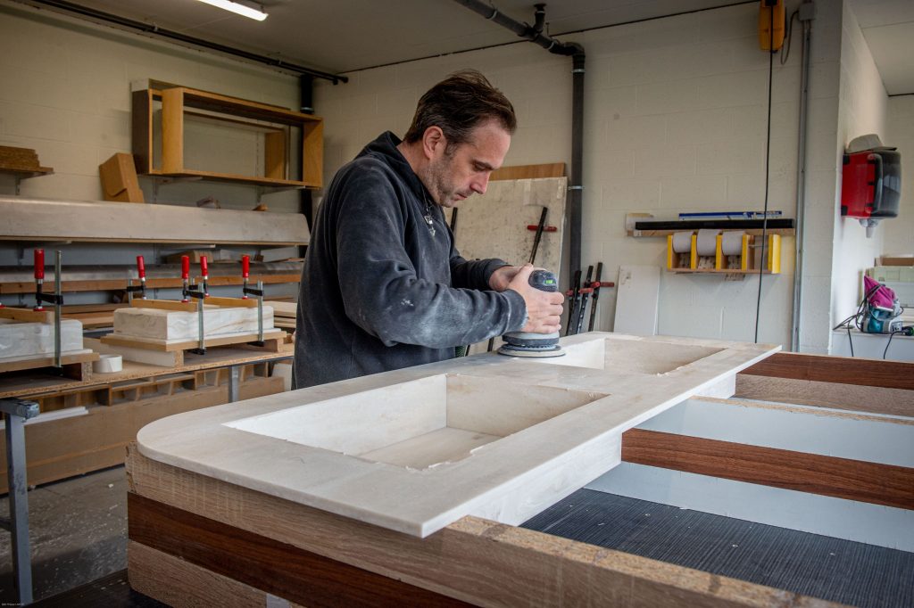 Pour répondre aux demandes et accompagner les clients, l’entreprise, qui emploie 25 personnes, s’est dotée d’un bureau d’études, dans lequel on retrouve, entre autres, des architectes d’intérieur. Les projets sont ensuite concrétisés sur place, au sein de l’atelier, grâce au savoir-faire de l’équipe d’ébénistes. Une zone spéciale est notamment réservée à l’utilisation de Corian, un matériau composite qui peut être modelé grâce à l’action de la chaleur.