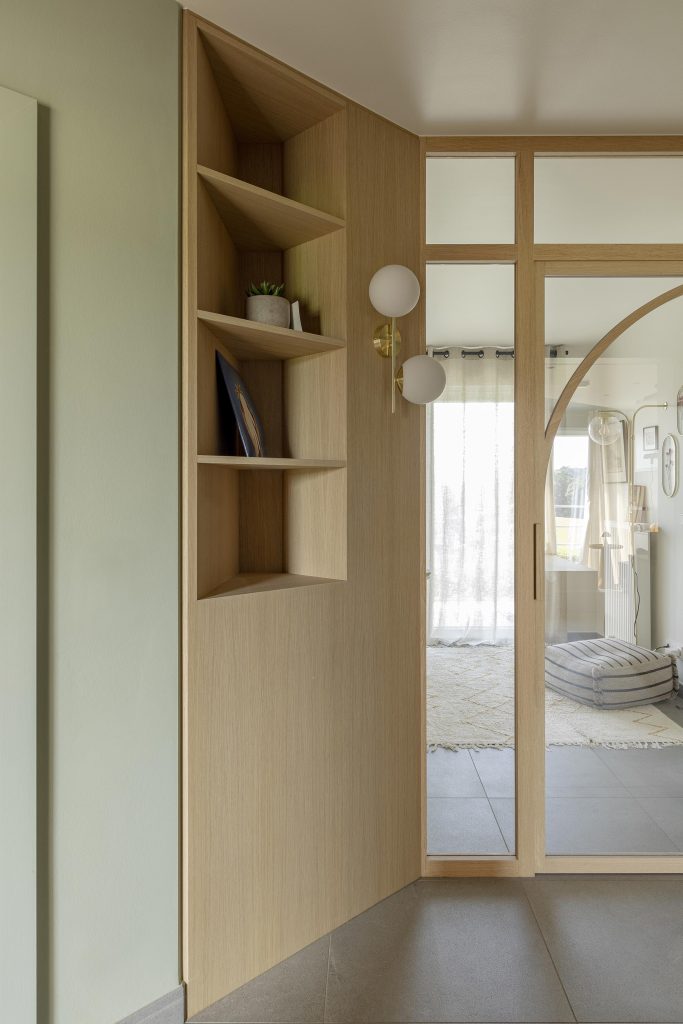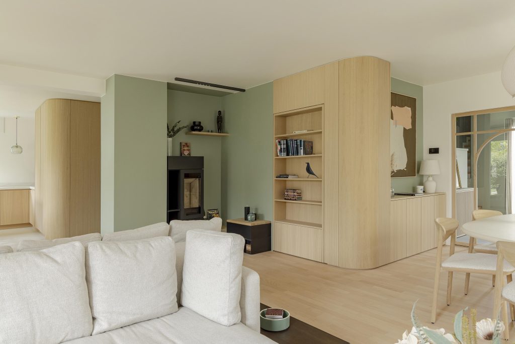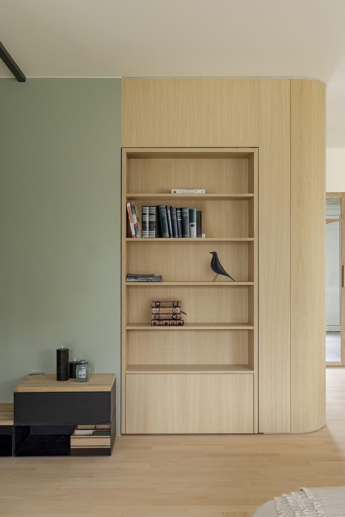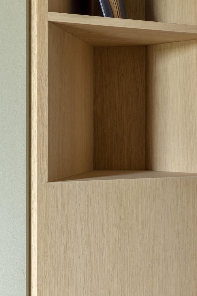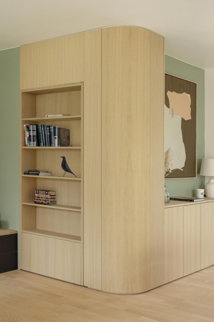 Une bibliothèque ouverte invite à la lecture et aux moments de partage. Elle est complétée par un meuble de rangement en MDF laqué dans un vert pastel comme le mur adjacent, dont la couleur délicate adoucit l’espace et lui apporte une touche de fraîcheur.