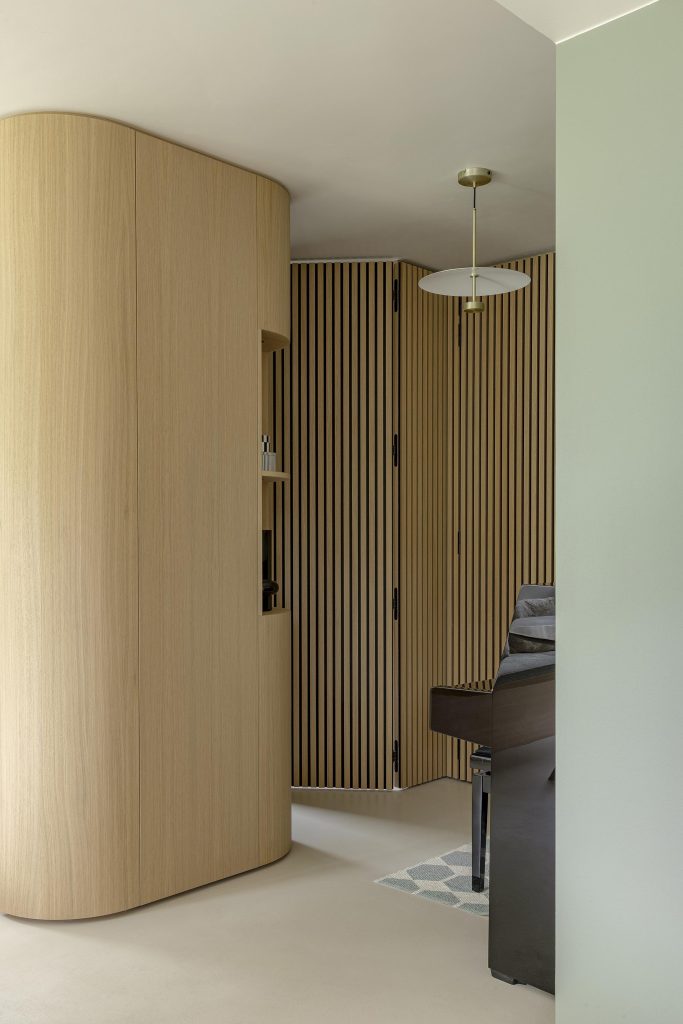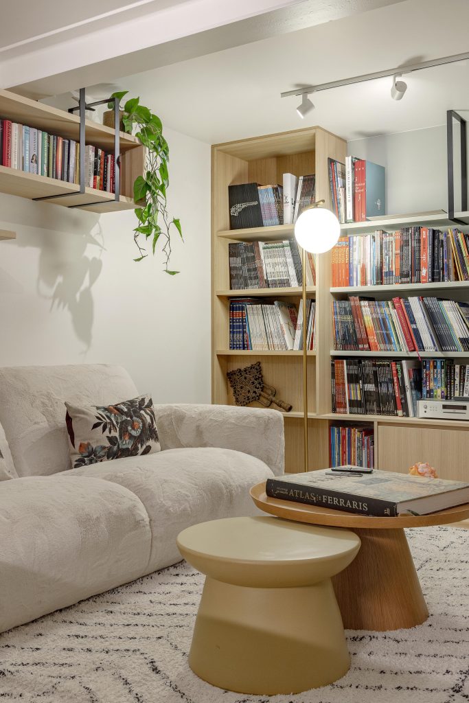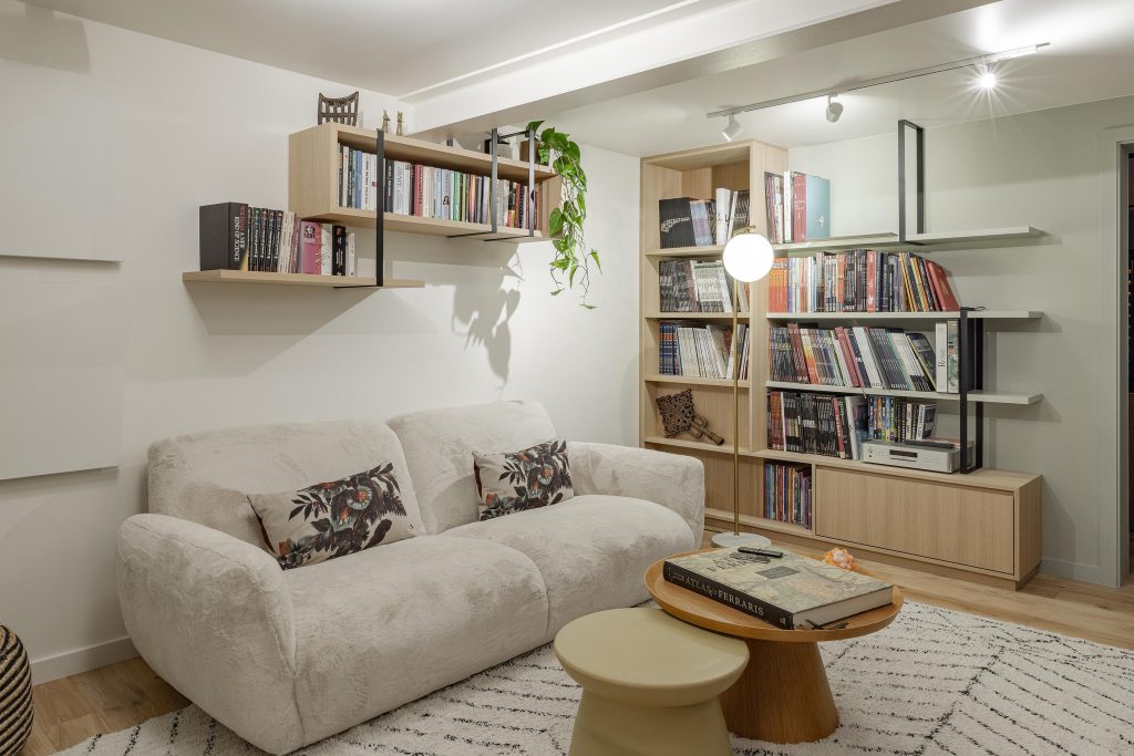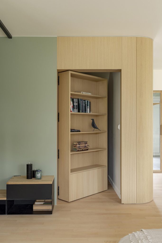 Mais derrière l’apparente simplicité de la bibliothèque se cache un détail aussi ludique qu’inattendu : une porte discrète donnant accès à une pièce secrète. Un clin d’œil assumé à nos rêves d’enfance, qui apporte au projet une dimension unique et personnelle.