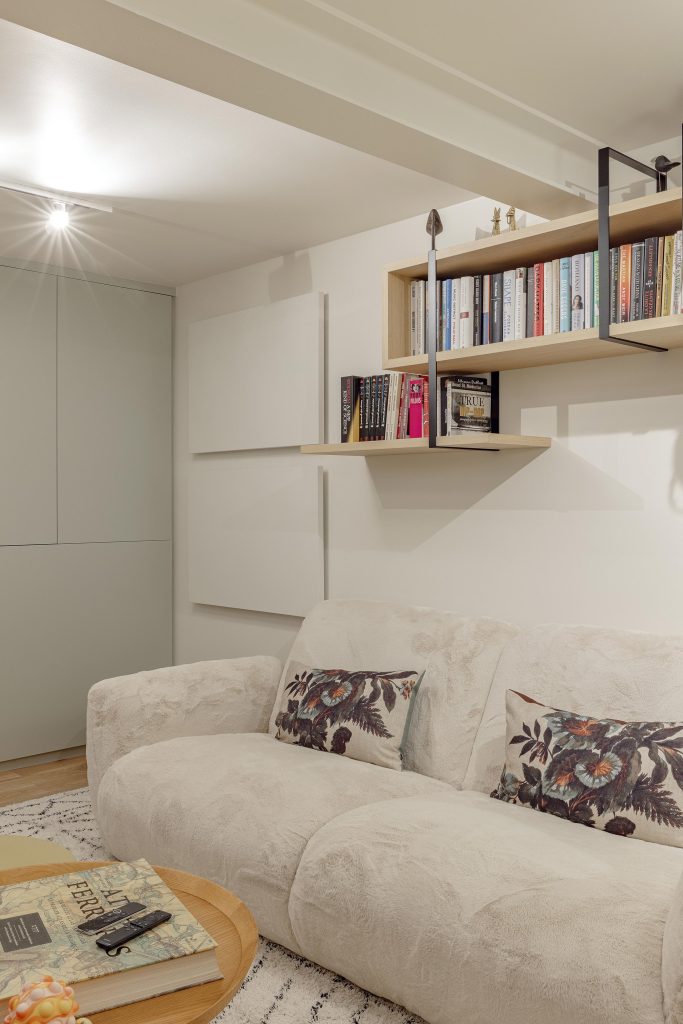 Malgré l’absence de lumière naturelle, l’aménagement mise sur des matériaux et des teintes douces pour créer une atmosphère enveloppante.