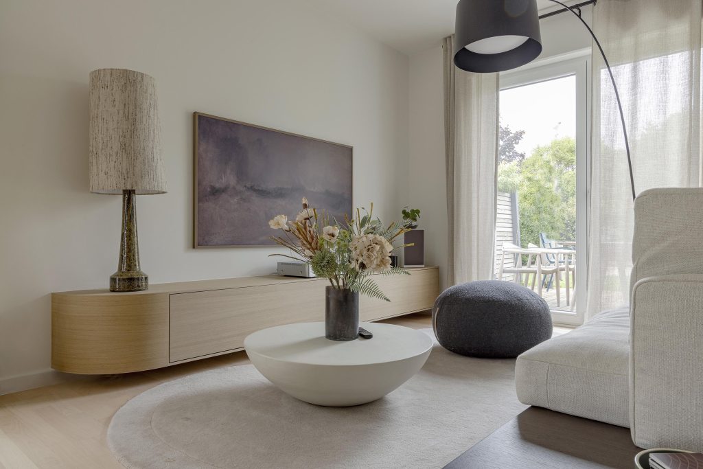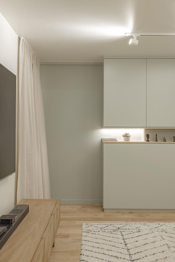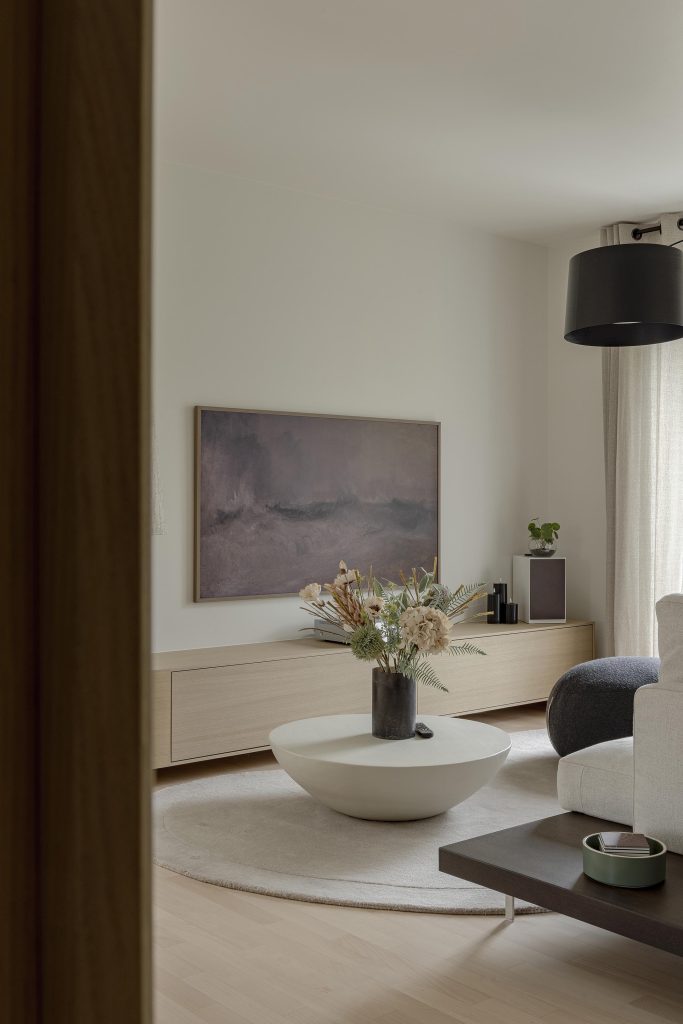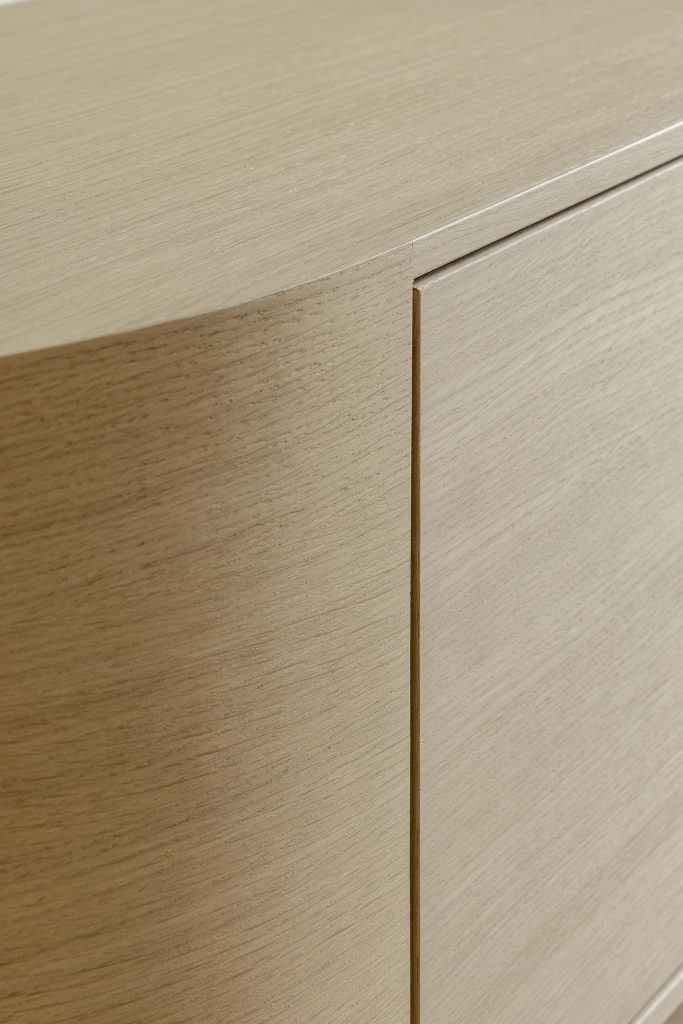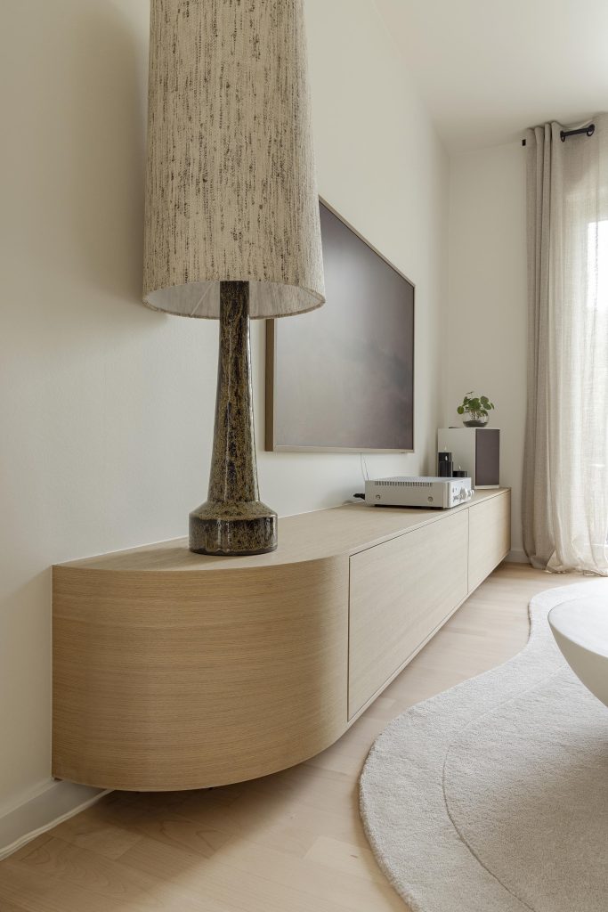 La particularité de ce meuble TV réside dans son extrémité gauche subtilement arrondie, qui adoucit la perspective et apporte une touche de légèreté à l’ensemble, faisant écho aux autres courbes présentes dans le projet.