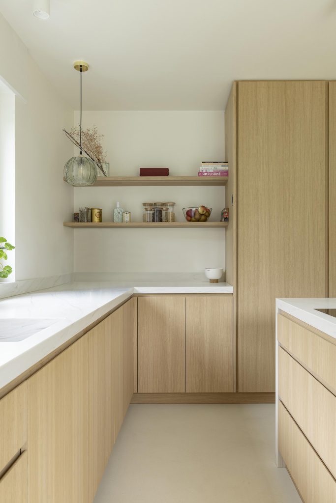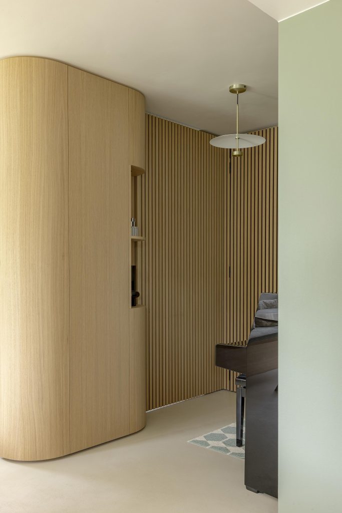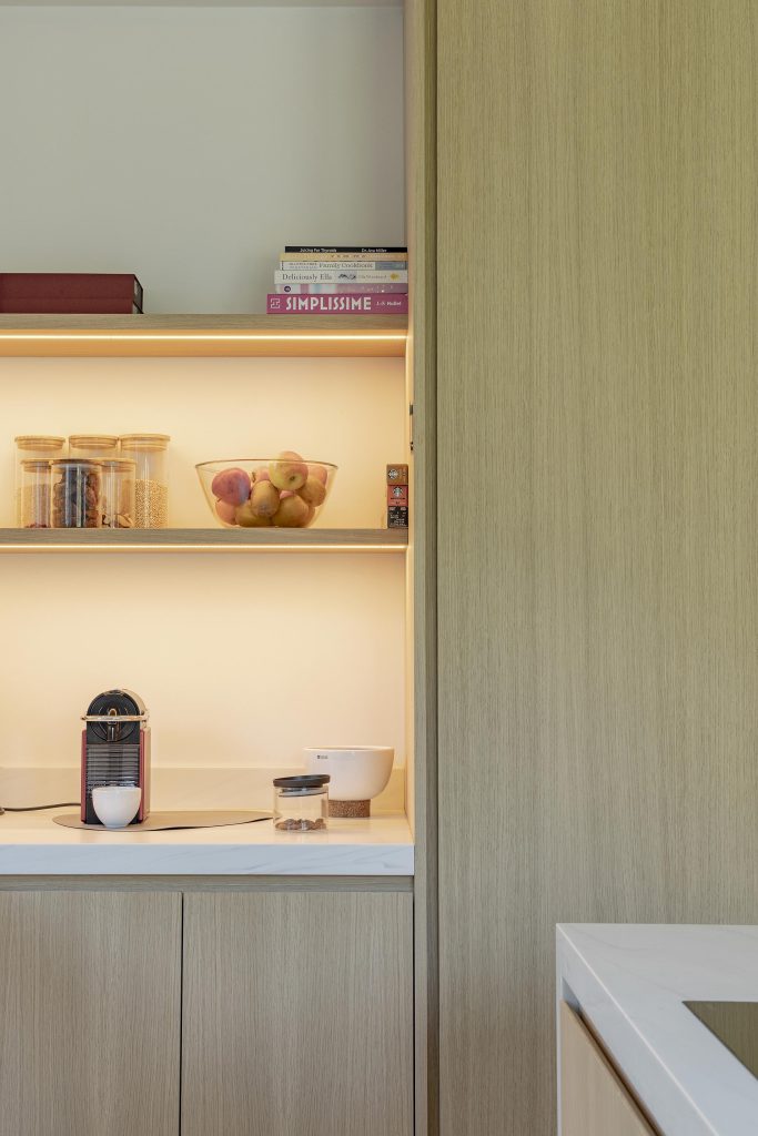 Les tablettes rétroéclairées viennent souligner la composition et apportent une ambiance chaleureuse tandis qu’une porte décorative en claustra, réalisée à partir de panneaux acoustiques, marque la transition vers le cellier avec légèreté.