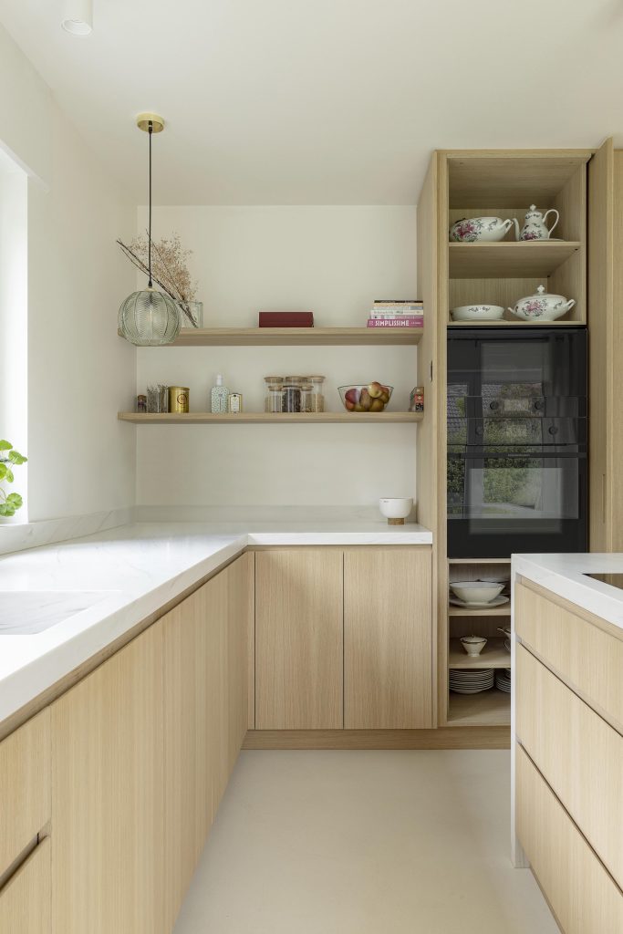 Une attention particulière a été portée à l’ergonomie : des portes rentrantes dissimulent les fours tout en libérant entièrement le passage, offrant un confort d’utilisation optimal face à l’îlot central.
