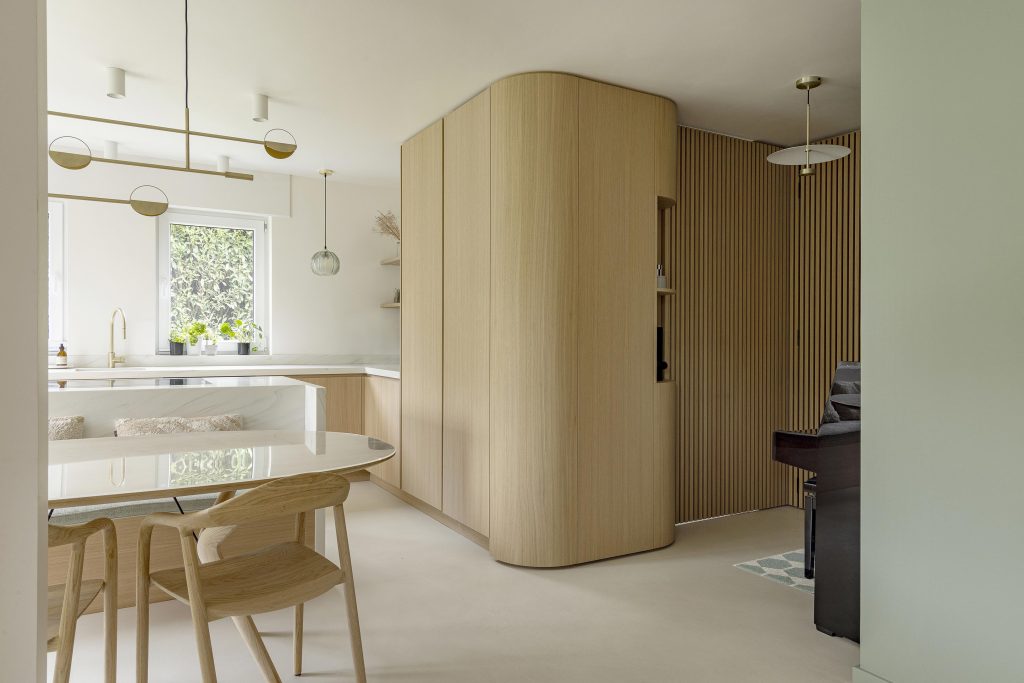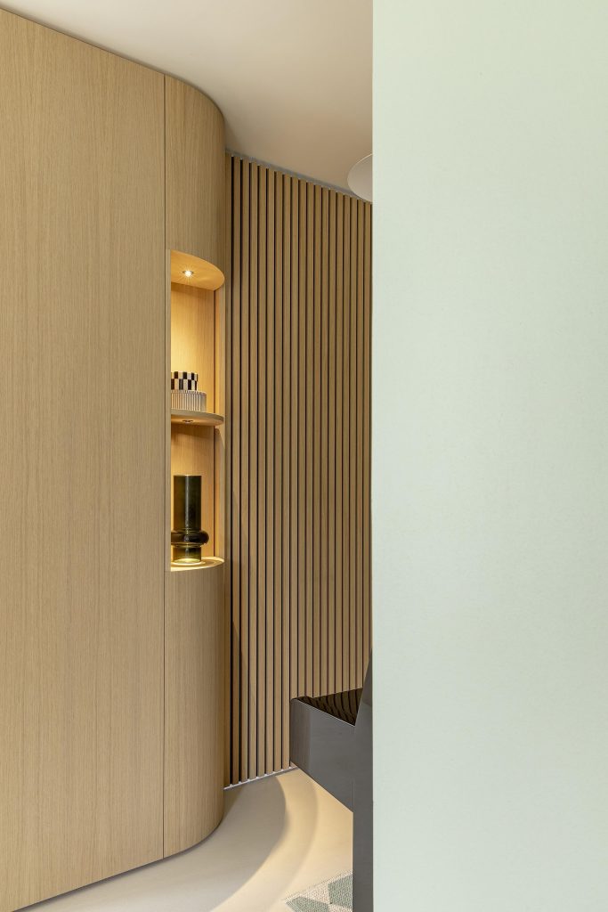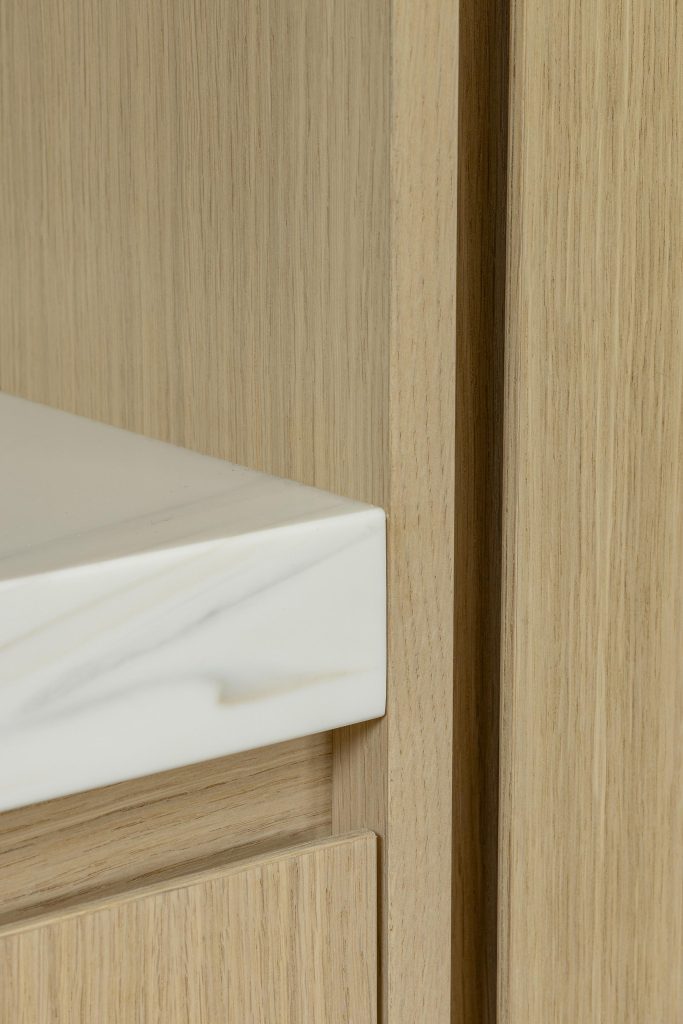Dans ce projet, chaque intervention a été pensée comme une pièce d’un ensemble harmonieux. Le fil conducteur : des lignes épurées, des formes arrondies et une palette de matériaux chaleureuse dominée par le placage chêne, teinté et vernis avec soin dans notre atelier.
