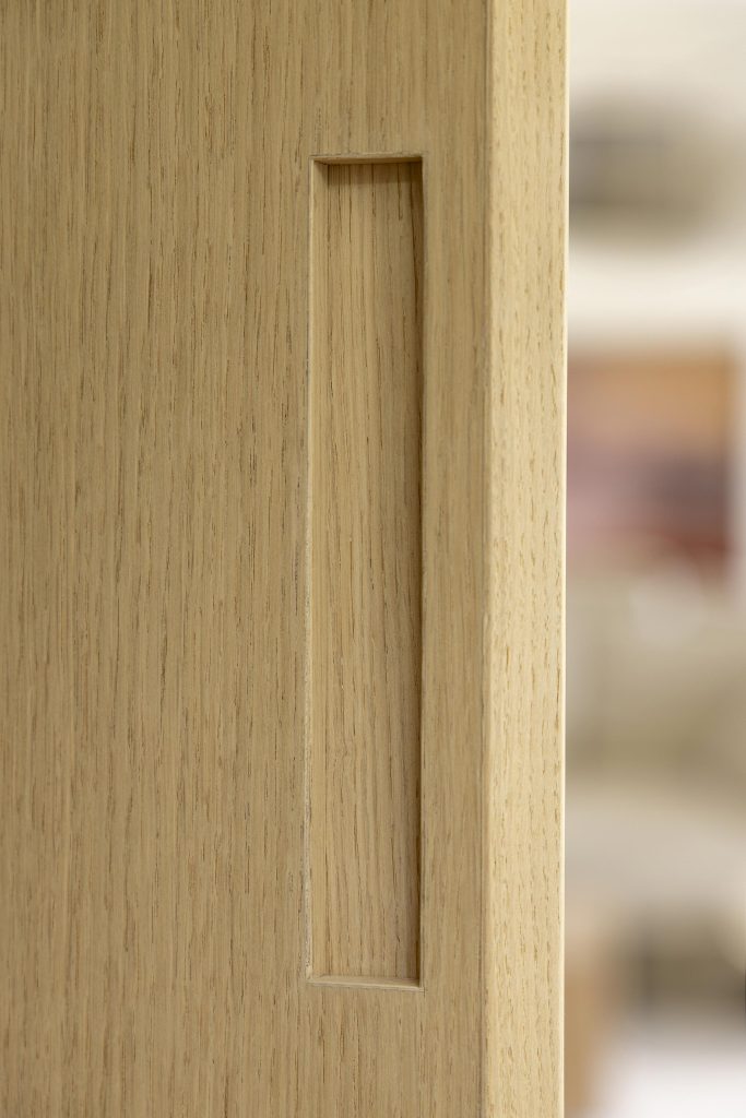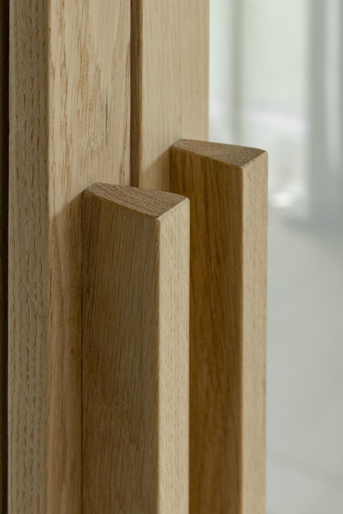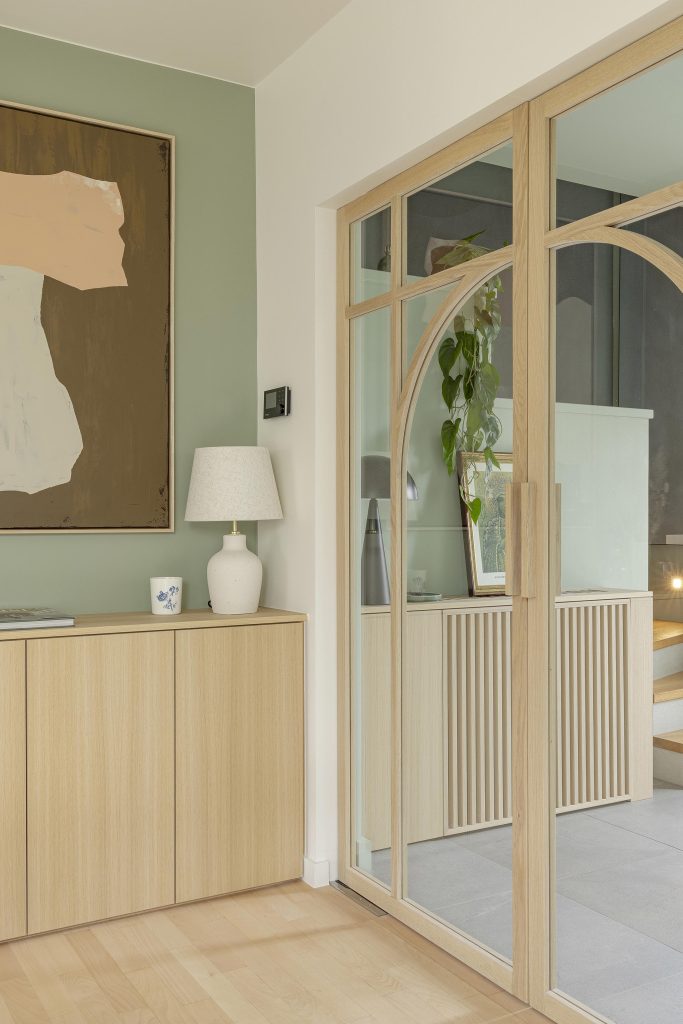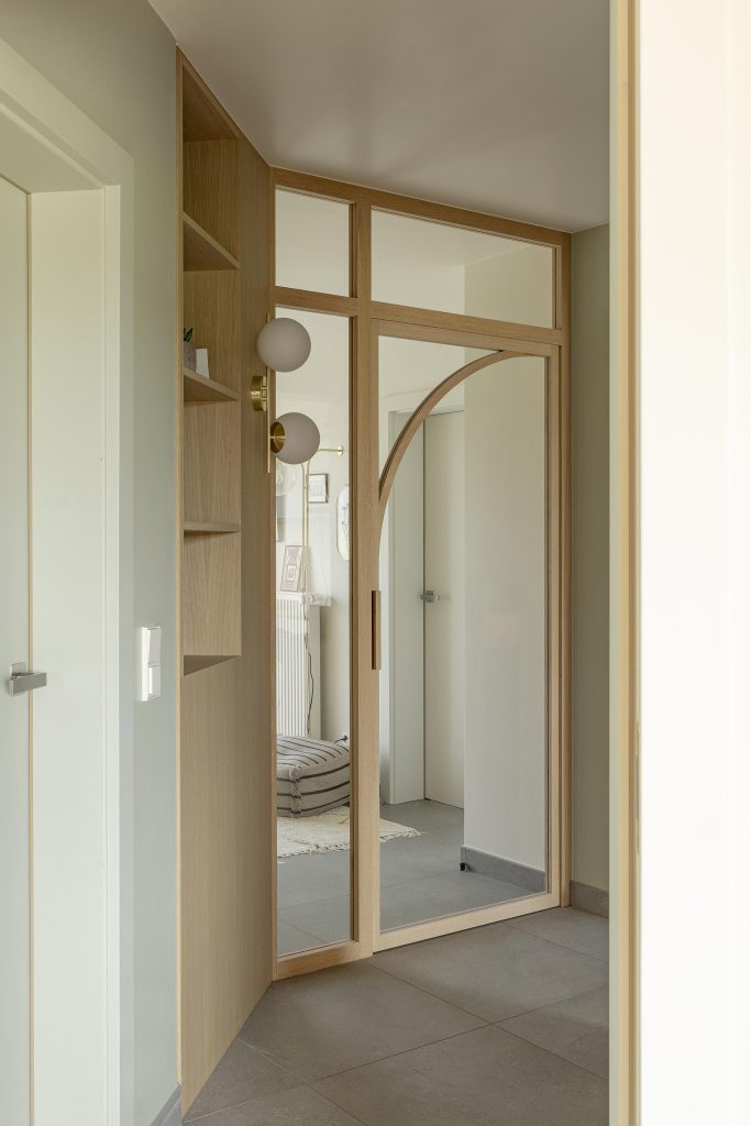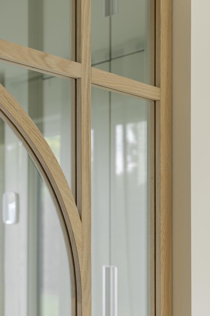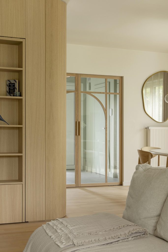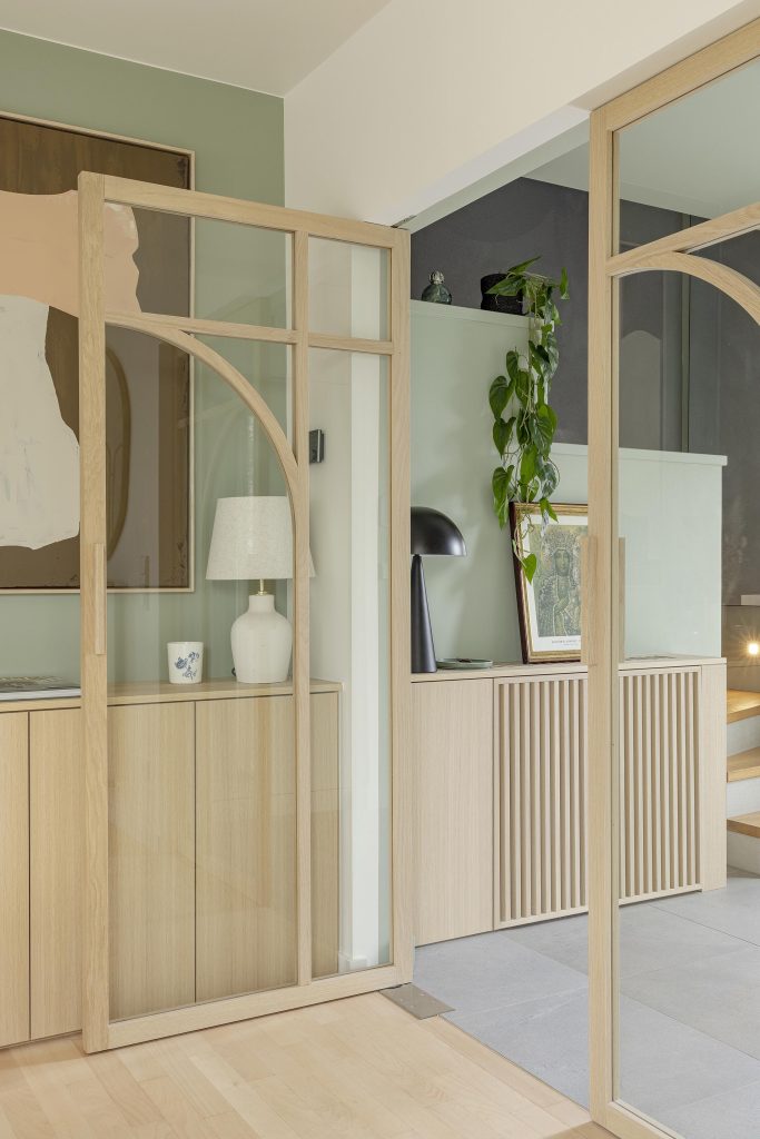 Les portes du rez-de-chaussée participent pleinement à l’identité du projet. Leur structure en chêne massif, réalisée sur mesure, dessine un motif graphique élégant, marqué par une arche subtile.