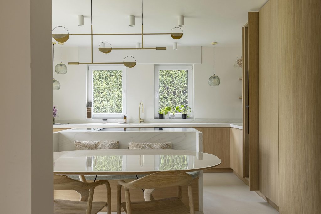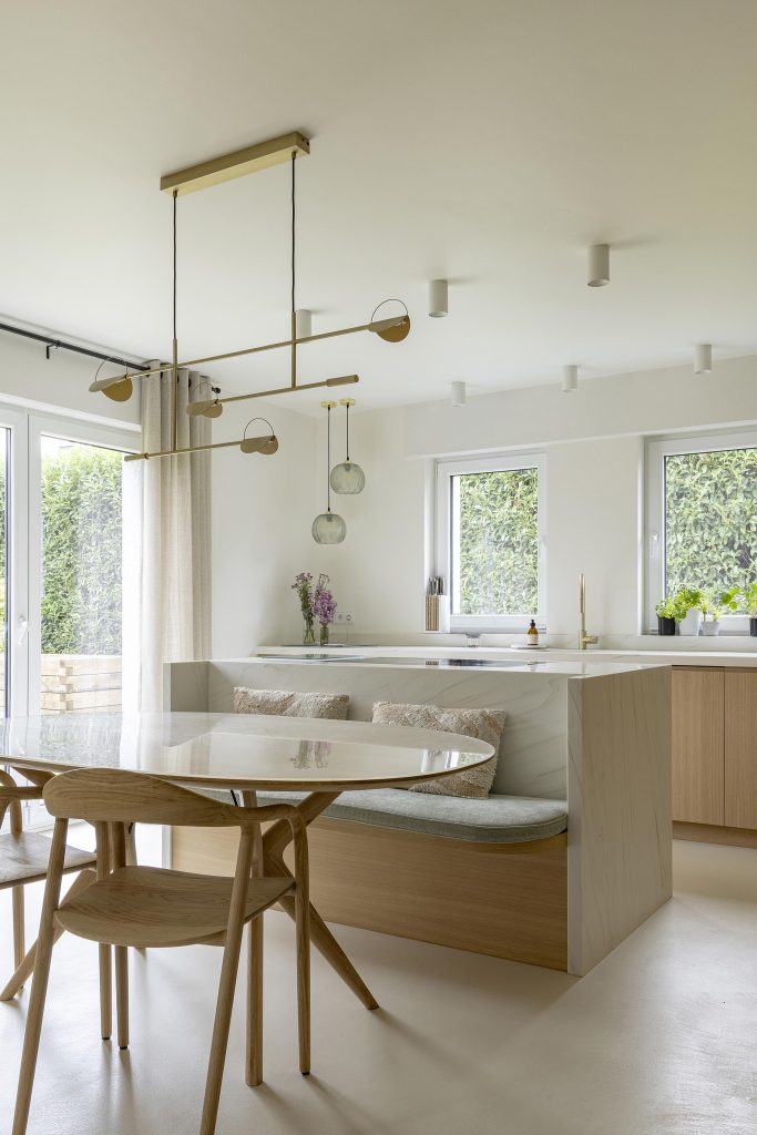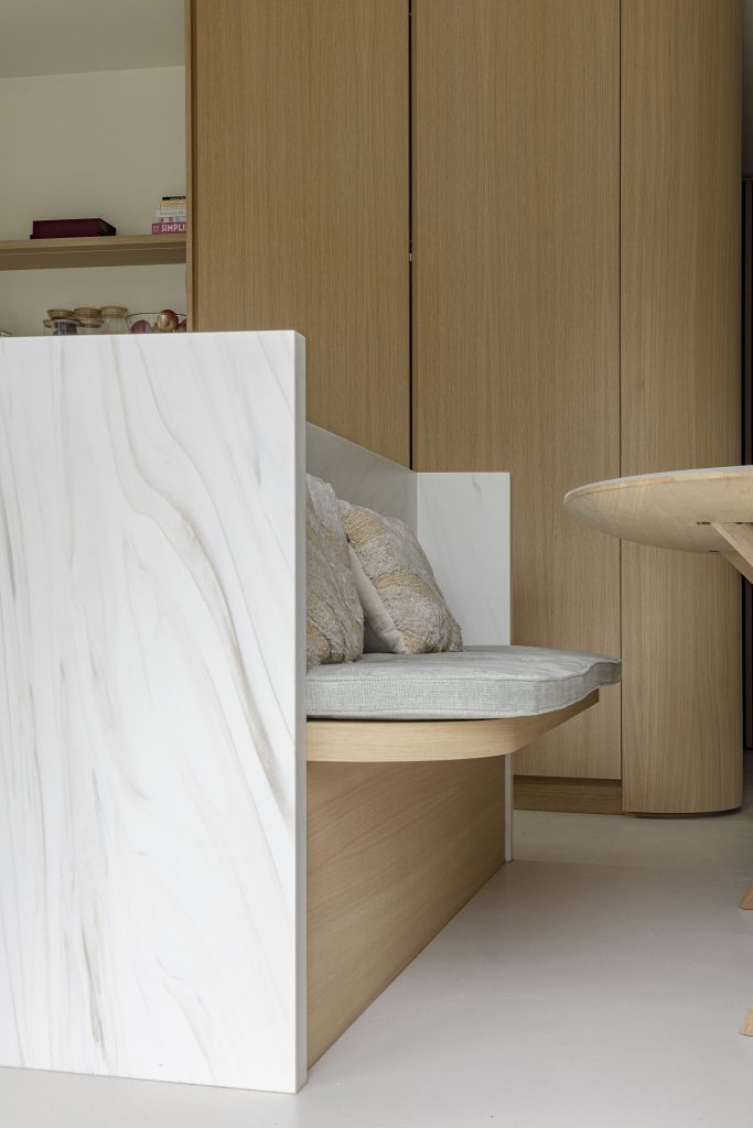Celui-ci, réalisé en Corian Calacatta Greige, intègre une banquette conviviale et prolonge les plans de travail et l’évier, créant une continuité visuelle douce et élégante. La taque Novy Panorama Pro s’y intègre parfaitement, renforçant la pureté des lignes, tandis que le mitigeur Blanco vient compléter l’ensemble avec discrétion et qualité.