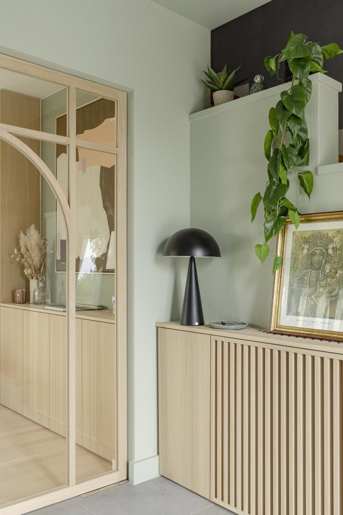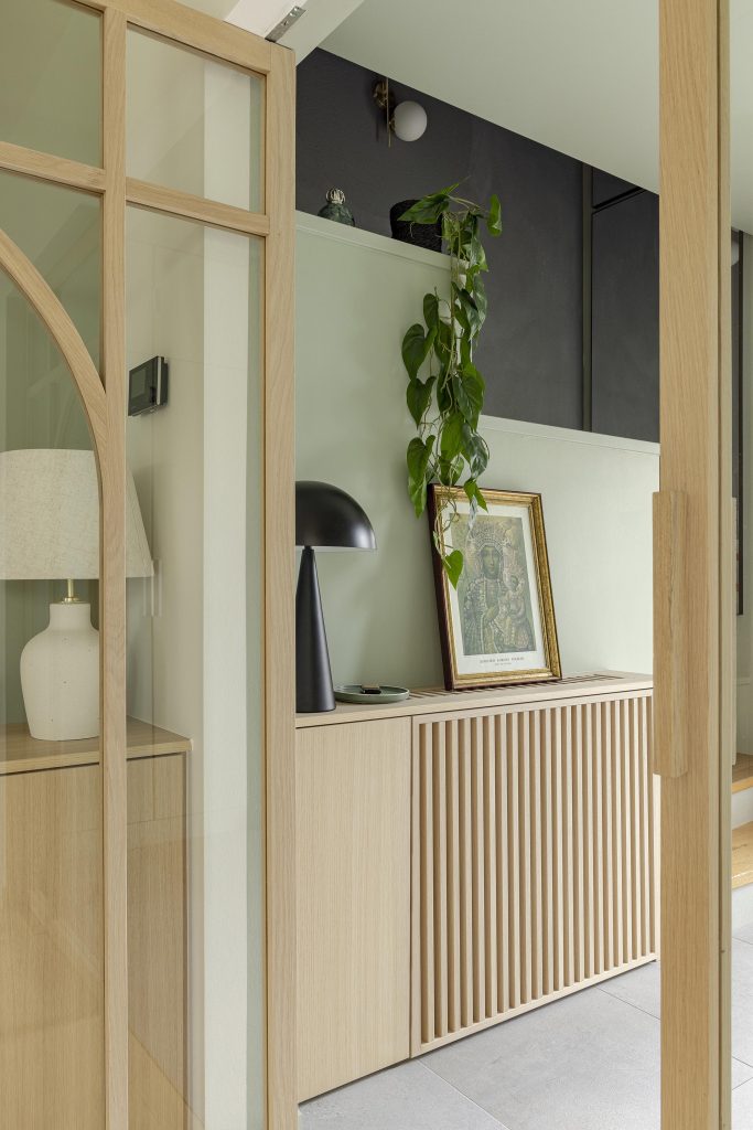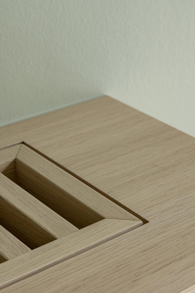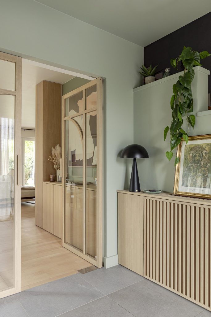 Dans le hall d’entrée, nous avons réalisé le cache-radiateur qui intègre un passe-câble discret sur la tablette, permettant d’alimenter une source lumineuse et de créer une ambiance douce dans cet espace de passage. Sous cette lampe, une armoire de rangement vient compléter l’ensemble. Nous avons également créé une grille démontable afin de permettre un accès aisé au radiateur.