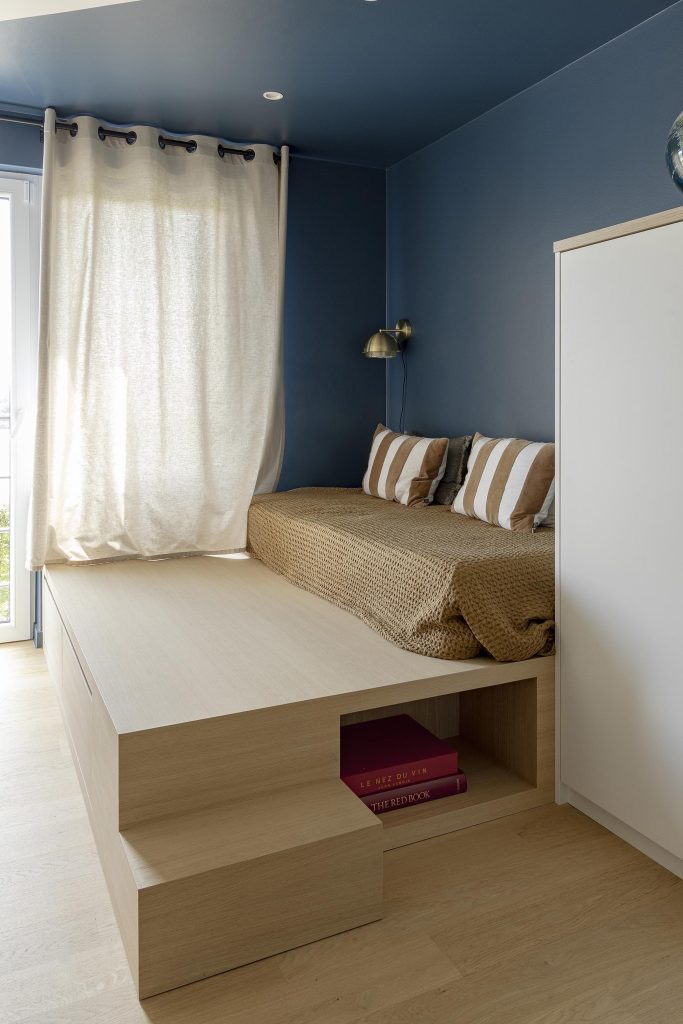Dans cette chambre, un podium sur mesure accueille le lit et structure l’espace avec douceur, tout en créant un univers à la fois ludique et apaisant.