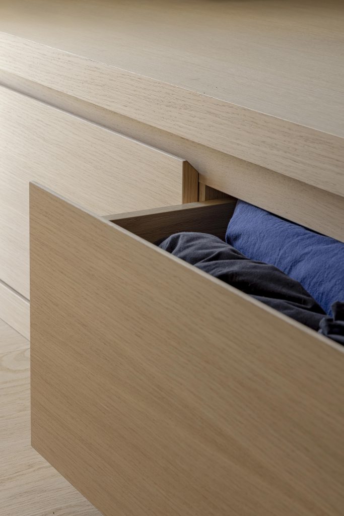 Intégré à cette réalisation, des rangements discrets ainsi qu’une petite bibliothèque prennent place sous le lit, offrant des solutions pratiques pour organiser livres, jouets et objets du quotidien.