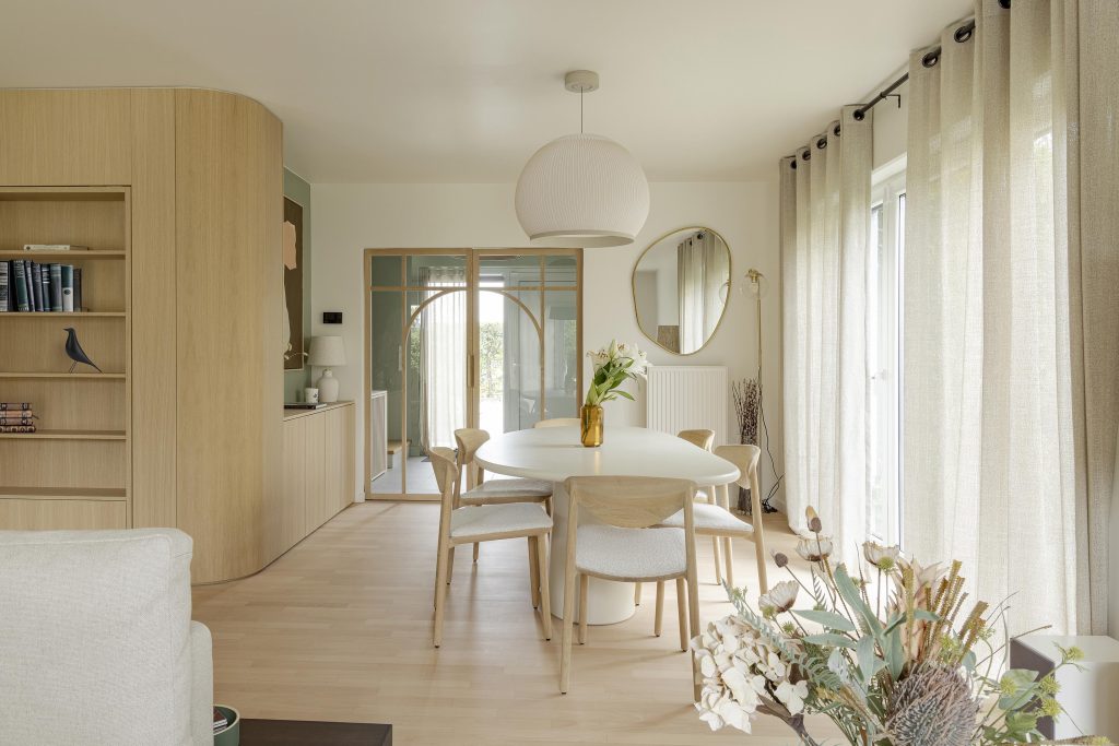 Au cœur de cet espace de vie baigné de lumière, une réalisation sur mesure attire immédiatement le regard : une bibliothèque aux lignes douces, pensée comme une pièce centrale du séjour, qui se prolonge en buffet près de la table à manger.