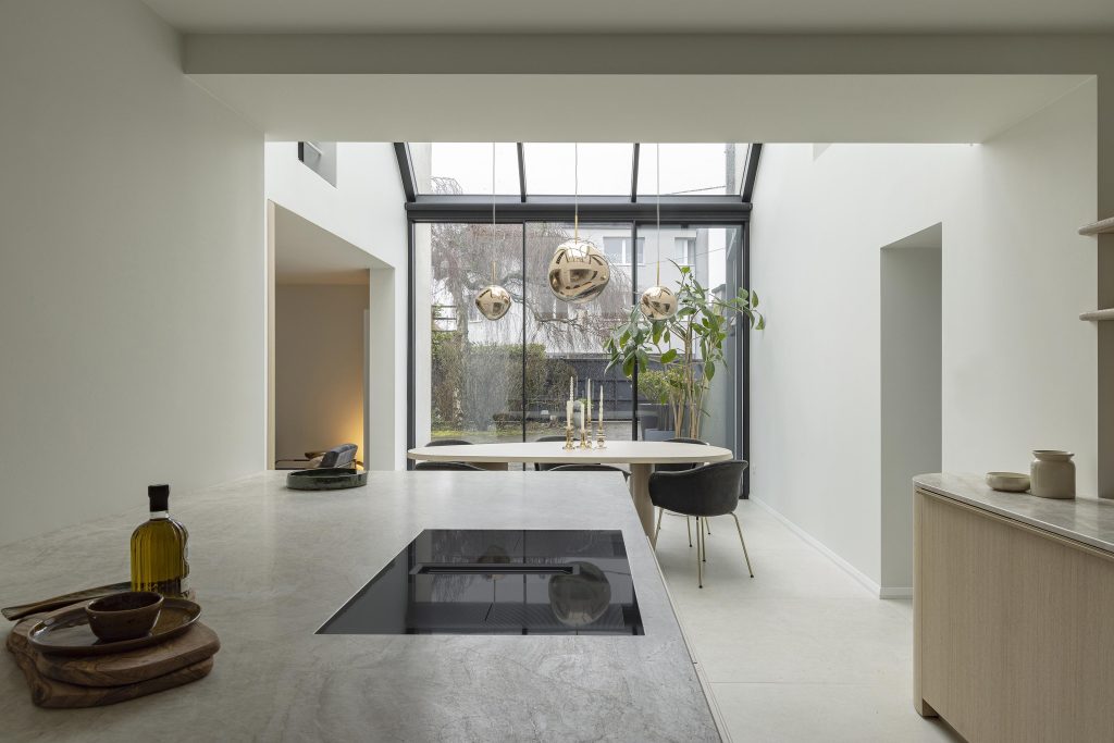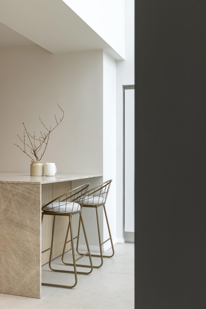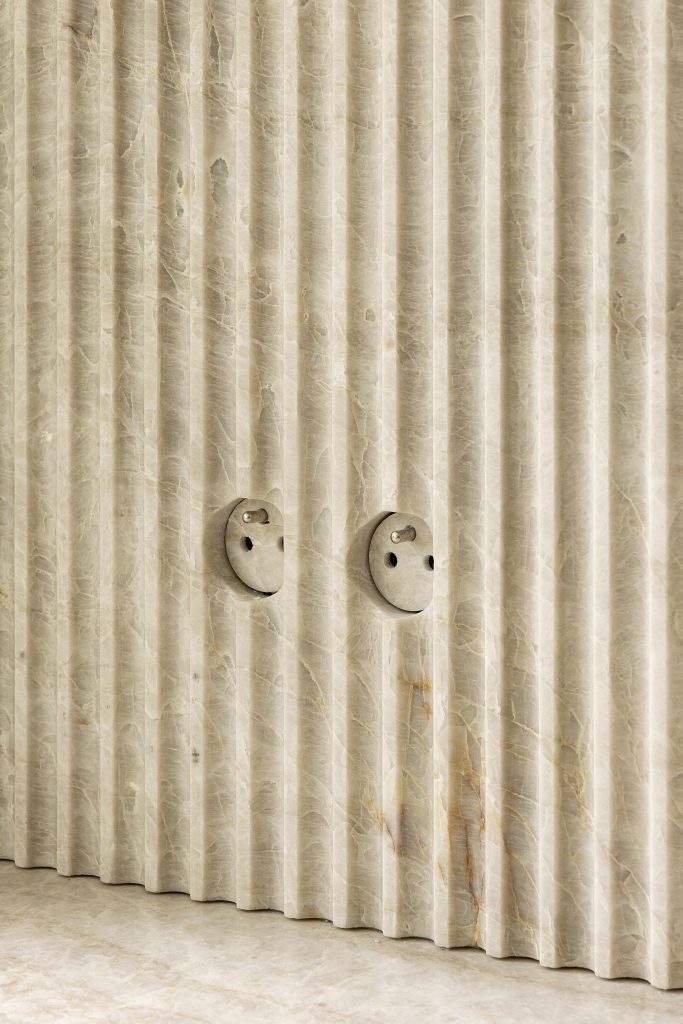 Le plan de travail en pierre « Taj Mahal« , sélectionné chez le marbrier Radermacher, apporte à la cuisine une élégante touche minérale. Cette pierre a également été utilisée pour la crédence structurée, créant une continuité naturelle et renforçant l’unité visuelle de l’ensemble. Les prises ont d’ailleurs été intégrées directement dans le Taj Mahal afin de se fondre discrètement dans la surface et préserver la pureté des lignes.