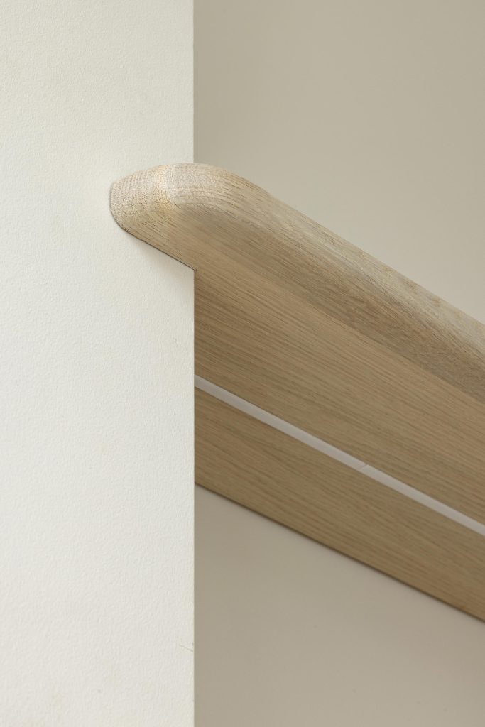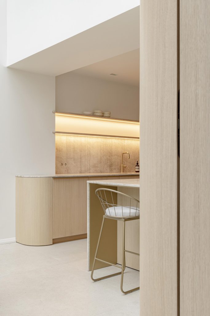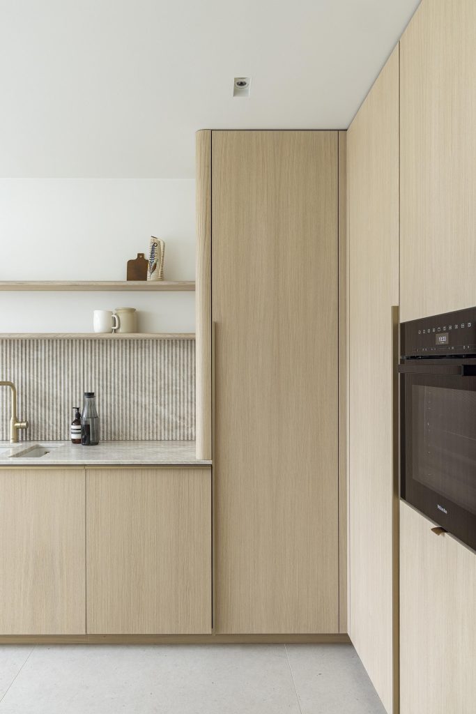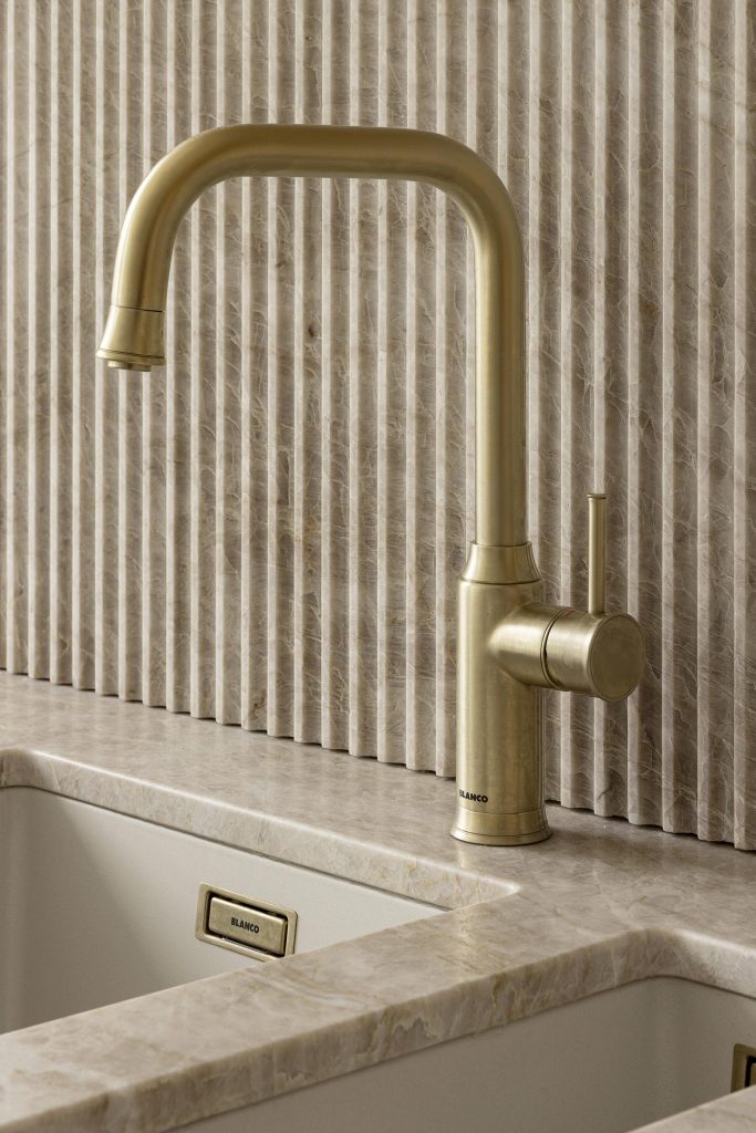 Les équipements ont été choisis avec le même souci du détail. L’évier et le mitigeur Blanco finition satin gold s’intègrent harmonieusement dans la composition et sont subtilement mis en valeur par les tablettes murales en chêne. Les arrondis aux coins des meubles viennent adoucir l’ensemble, apportant à la fois confort de circulation et douceur esthétique.
