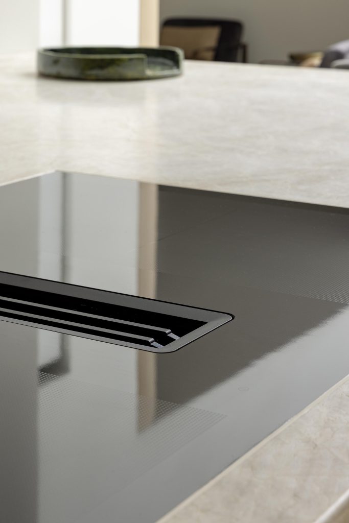 L’îlot accueille également une niche dorée rétroéclairée qui crée une ambiance chaleureuse tout en intégrant des prises discrètement positionnées à proximité de la taque de cuisson. Celle-ci, une taque MIELE avec aspiration intégrée, permet d’éviter l’installation d’une hotte murale ou plafonnière et de préserver la légèreté visuelle de la pièce.