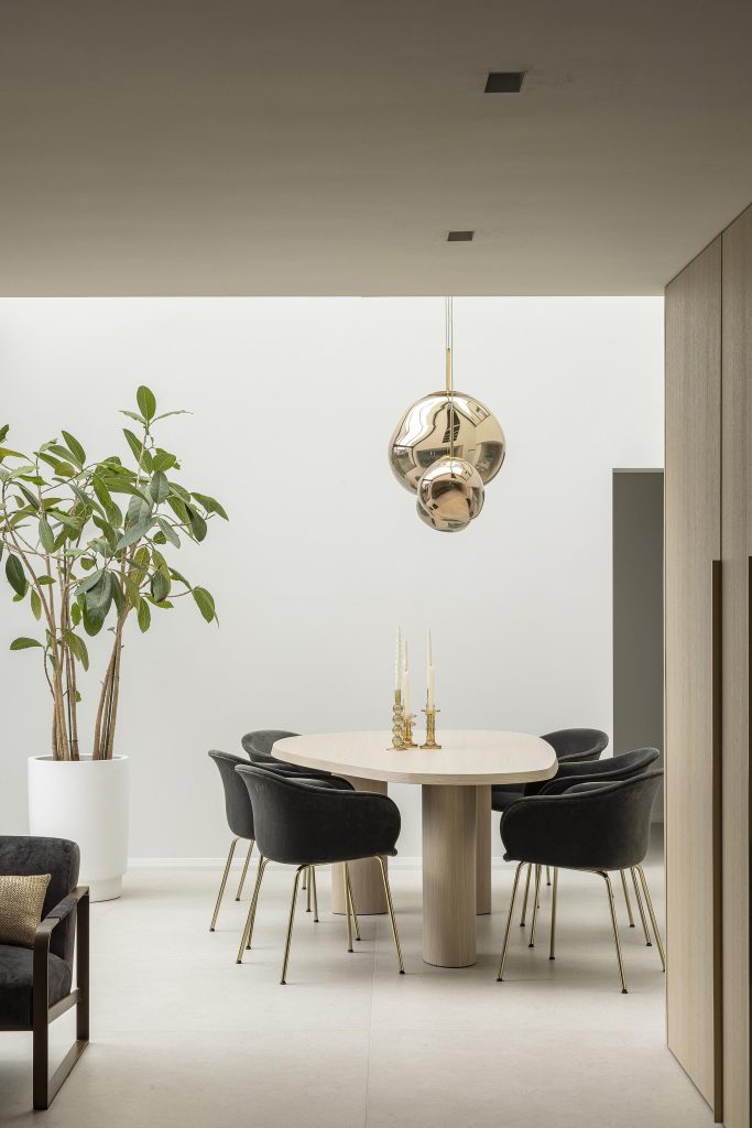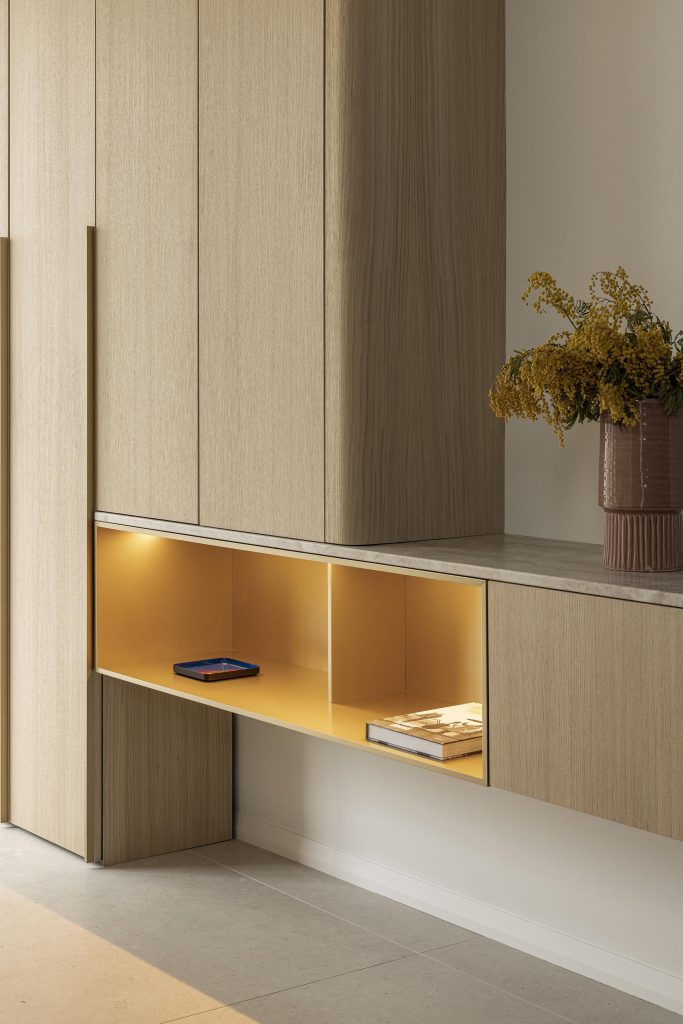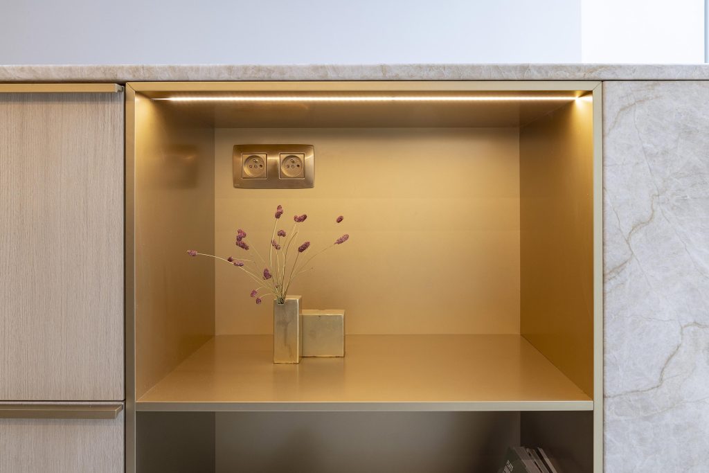 Il intègre un vaisselier dans la composition, ainsi qu’une niche dorée rétroéclairée qui fait subtilement écho aux détails présents dans la cuisine, créant un fil conducteur entre les différents espaces.