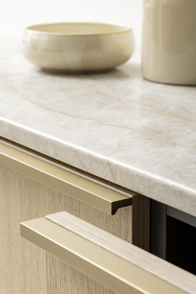 Les poignées fines et discrètes soulignent la sobriété des façades et permettent une lecture élégante et épurée de l’ensemble.
