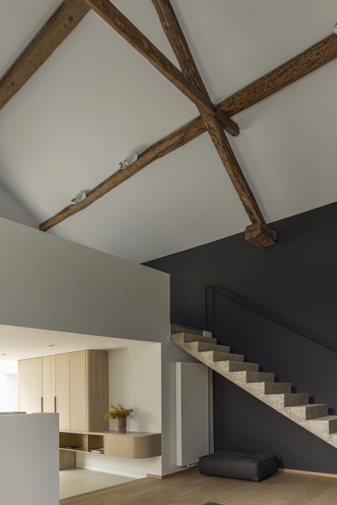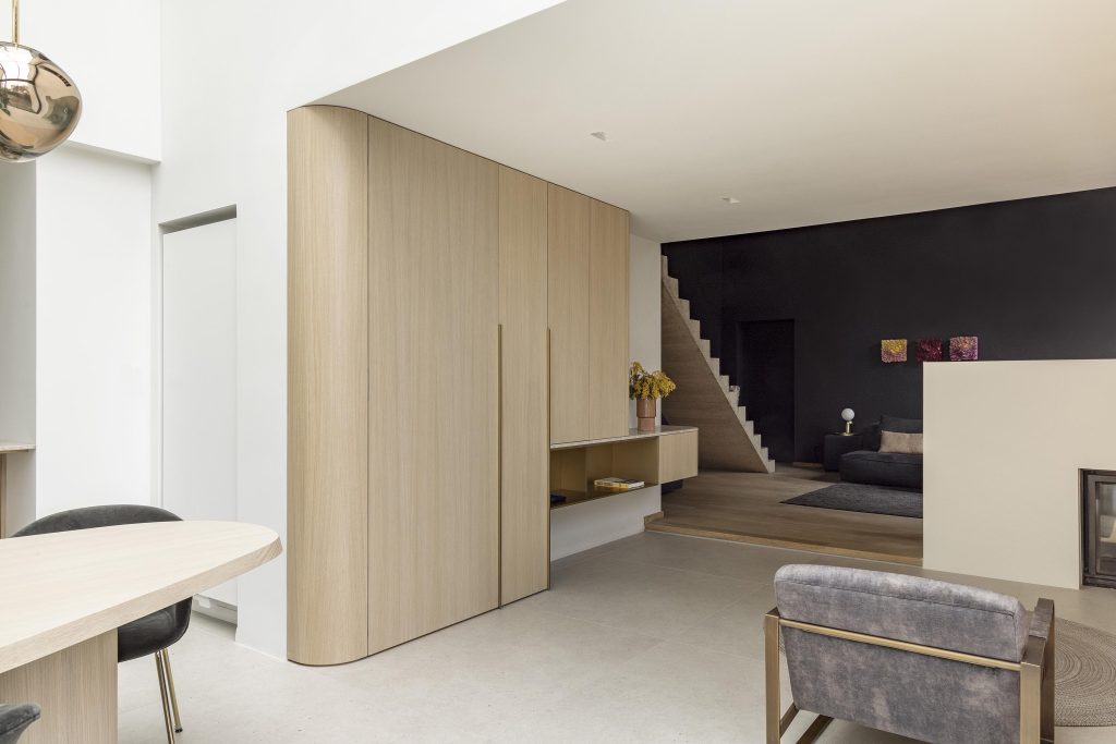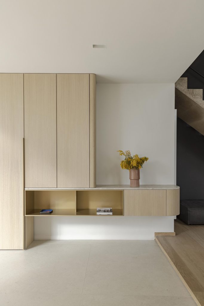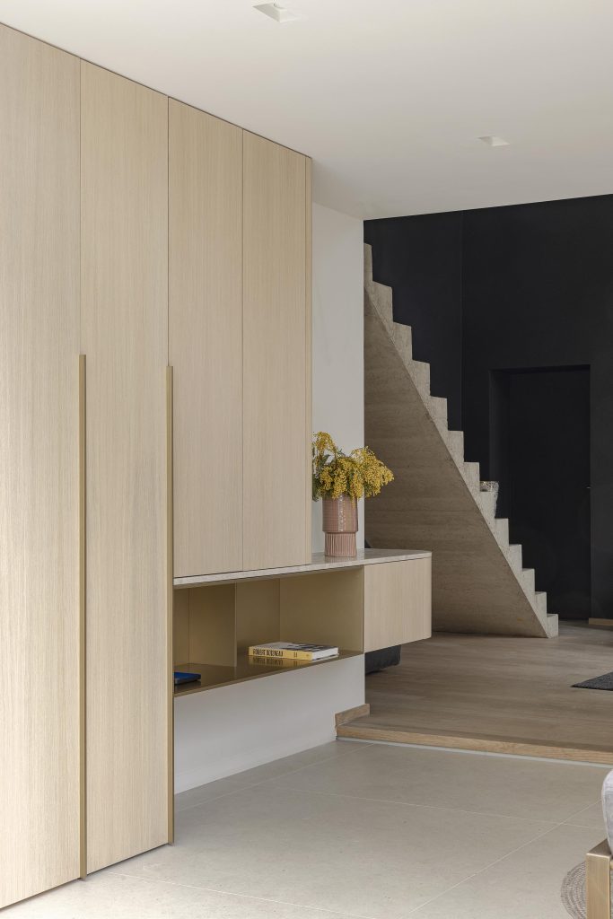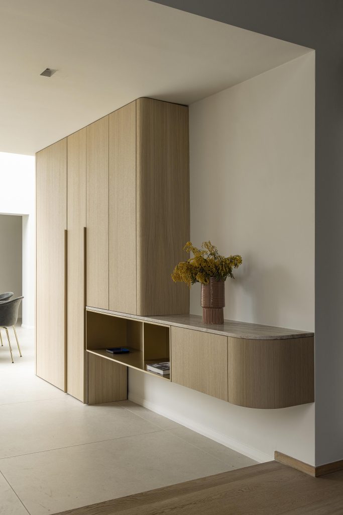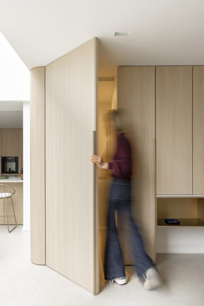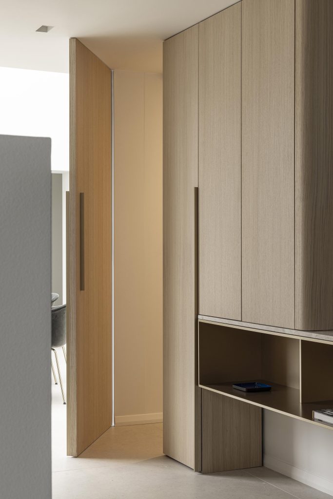 Enfin, une porte totalement dissimulée sur toute la hauteur du meuble permet l’accès au couloir menant aux toilettes. Pour préserver la pureté des lignes, cette porte est équipée de charnières invisibles, rendant le passage presque imperceptible et intégrant la fonction technique sans compromettre l’esthétique globale.