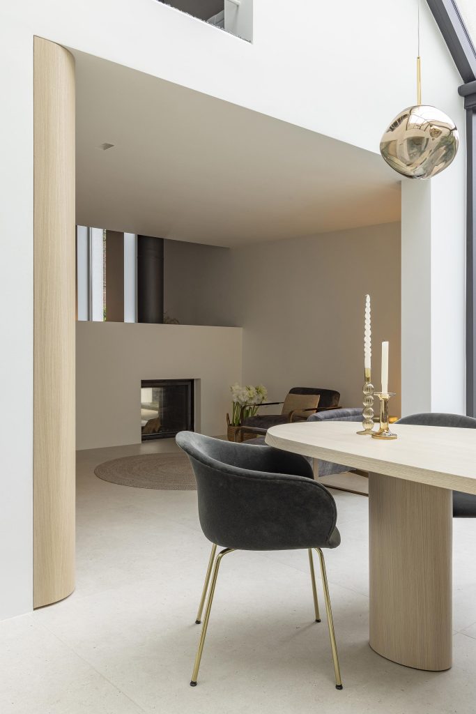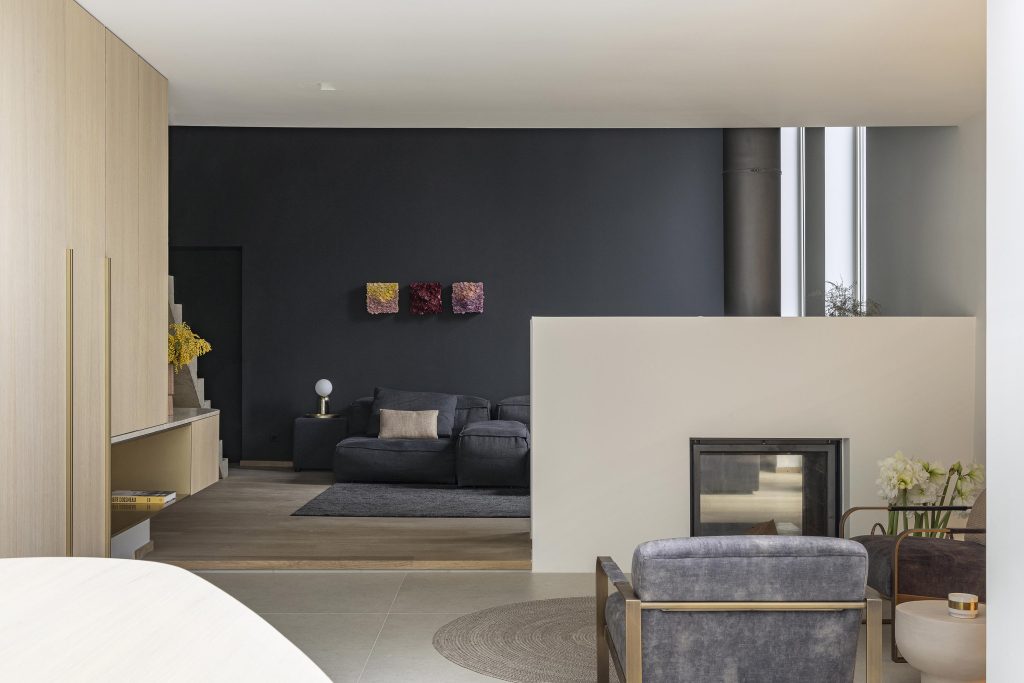 Un soin particulier a de nouveau été apporté aux arrondis, notamment au niveau du coin qui surplombe la marche menant au second salon garantissant une transition fluide entre les niveaux.