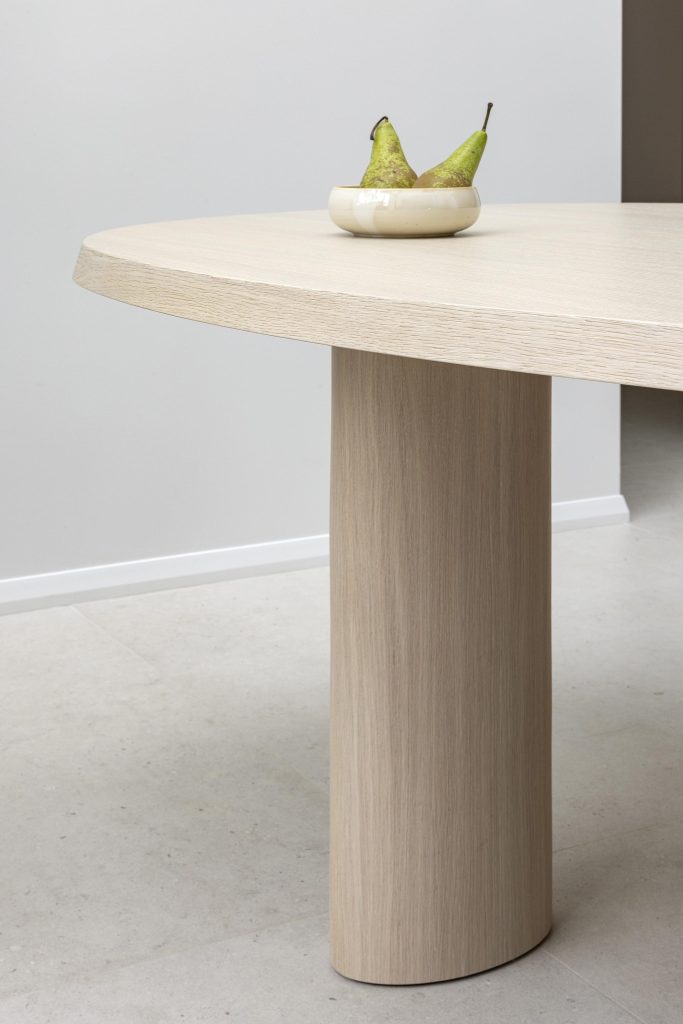 Sa forme organique apporte douceur et convivialité, tandis que son bord “aile d’avion” inversé souligne un travail de menuiserie précis et élégant. Le placage chêne, identique à celui de la cuisine, crée une continuité visuelle harmonieuse entre les espaces.