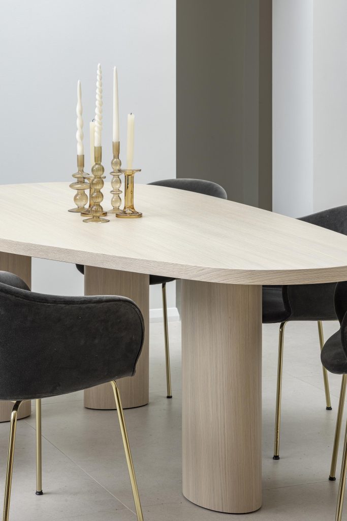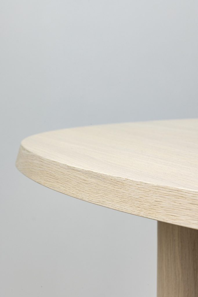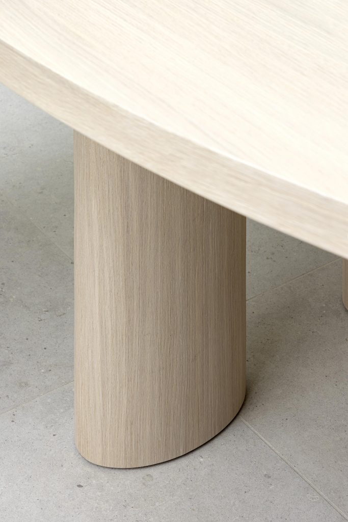 La table repose sur trois pieds cylindriques ovales qui assurent stabilité et renforcent le caractère sculptural du mobilier.