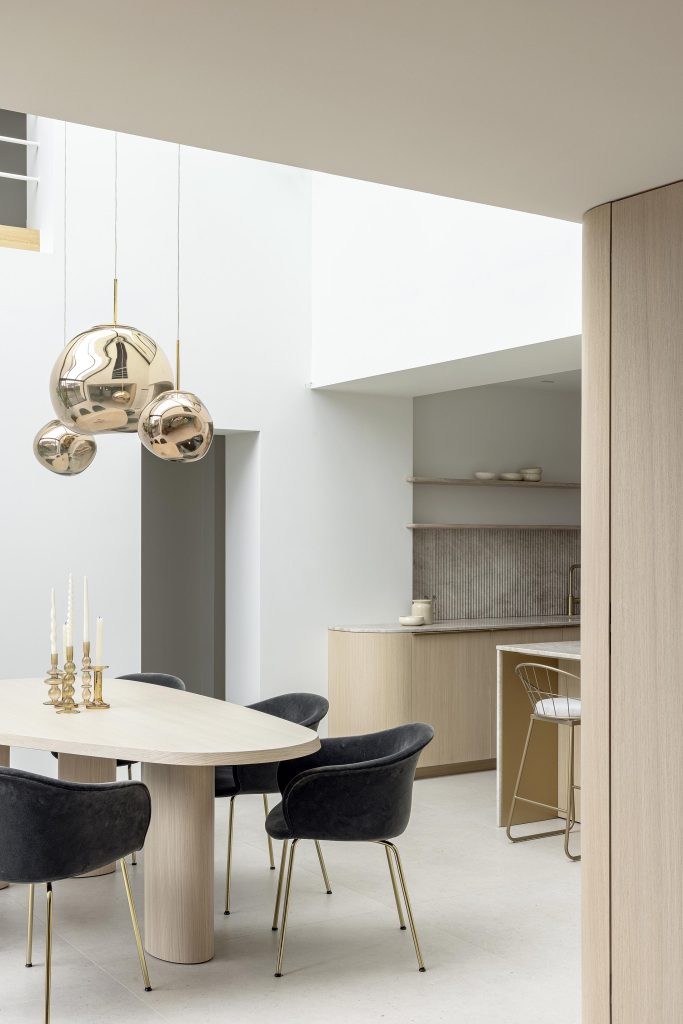 Dans le prolongement de la cuisine, nous avons conçu une table de salle à manger sur mesure, véritable pièce centrale de l’espace.
