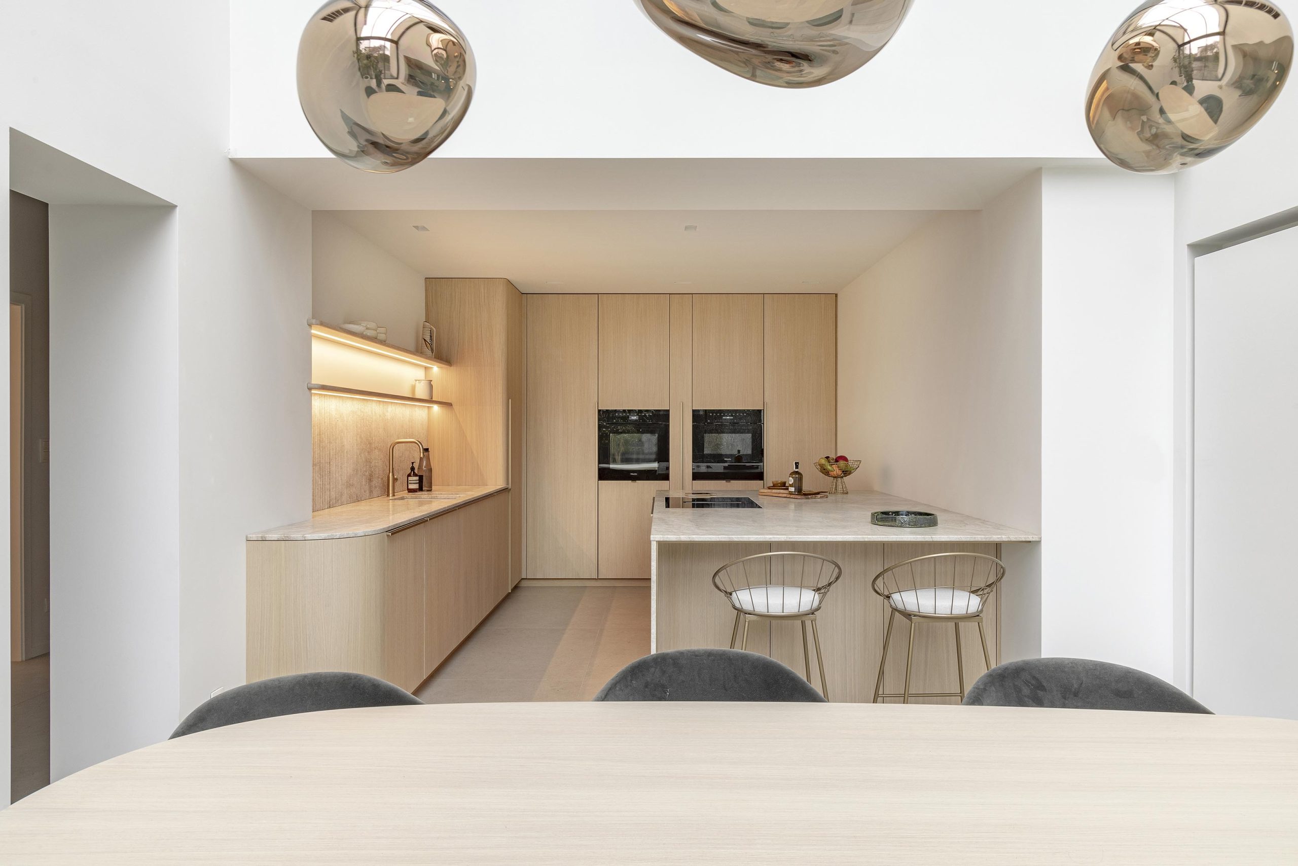 Les équipements ont été choisis avec le même souci du détail. L’évier et le mitigeur Blanco finition satin gold s’intègrent harmonieusement dans la composition et sont subtilement mis en valeur par les tablettes murales en chêne. Les arrondis aux coins des meubles viennent adoucir l’ensemble, apportant à la fois confort de circulation et douceur esthétique.